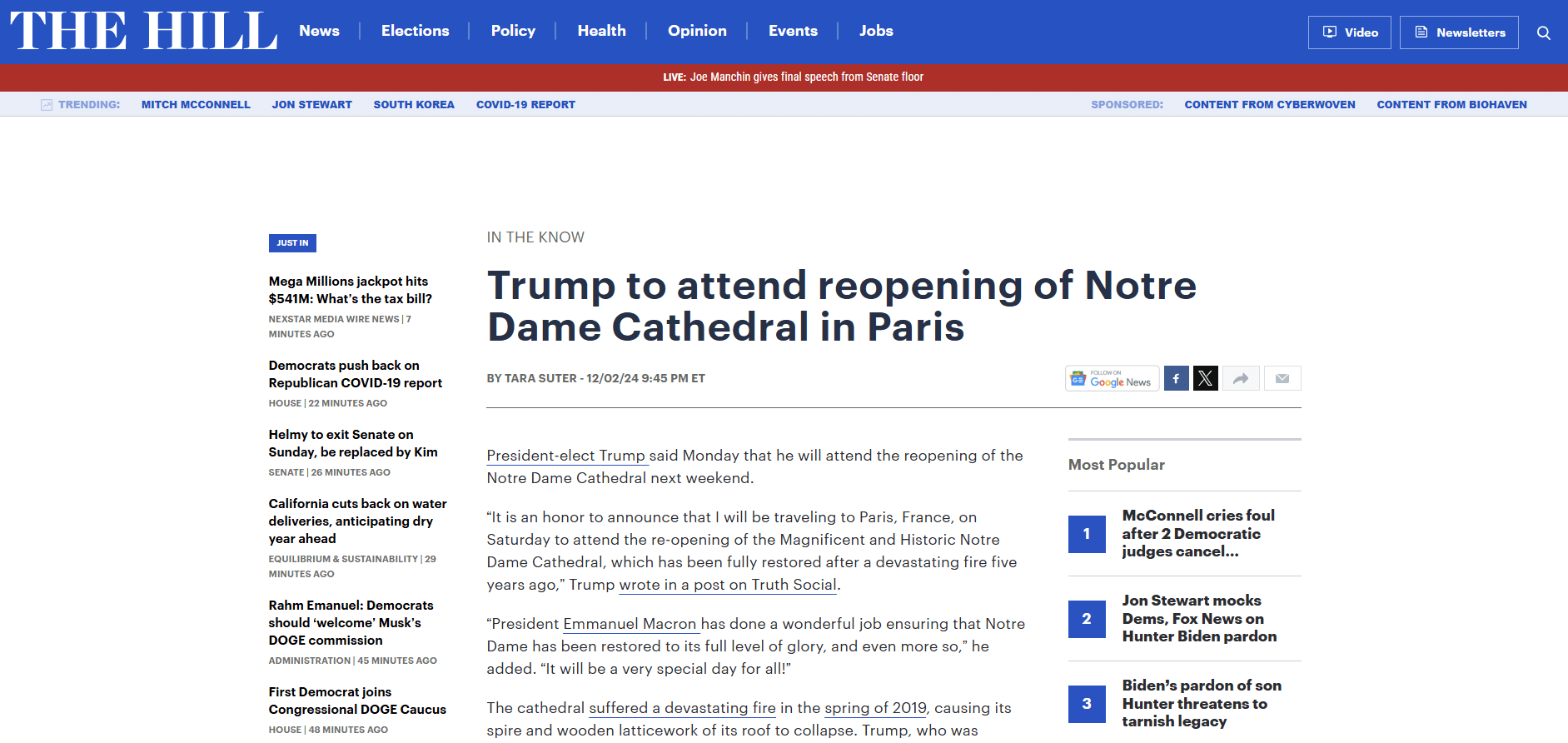 Trump to attend reopening of Notre Dame Cathedral in Paris