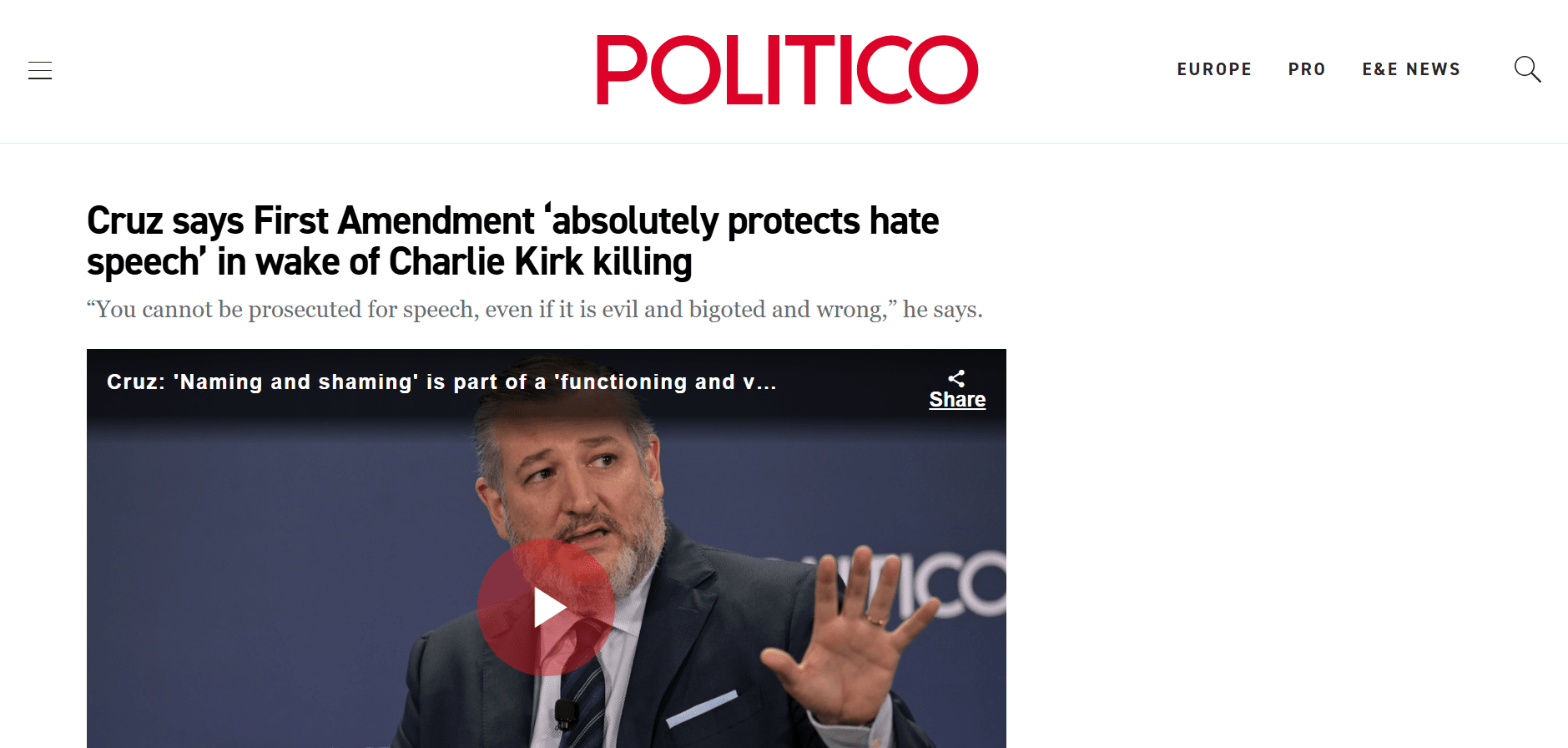 Cruz says First Amendment 'absolutely protects hate speech' in wake of Charlie Kirk killing