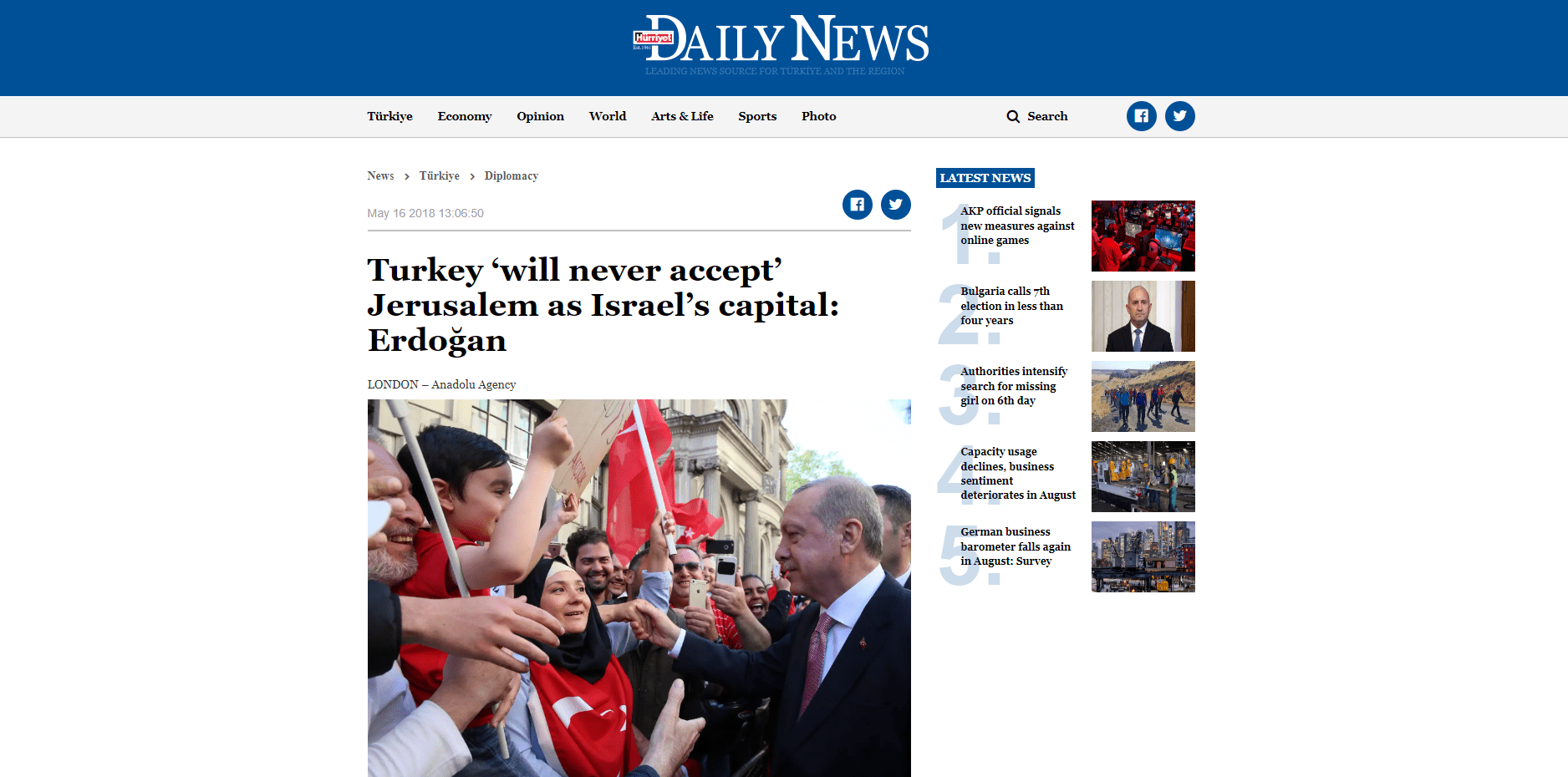 Turkey will never accept the U.S. decision to recognize Jerusalem as the capital of Israel, Turkish President Recep Tayyip Erdogan said on May 15.