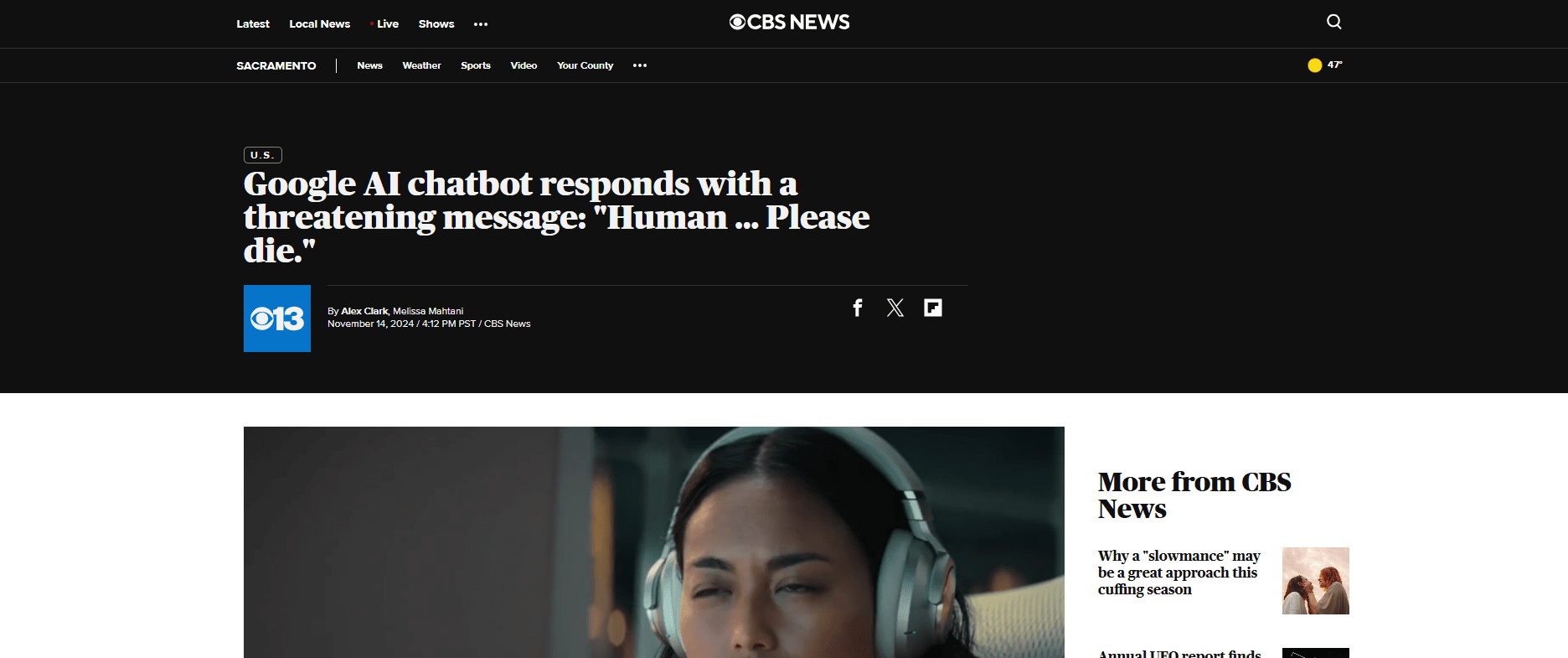 Google AI chatbot responds with a threatening message: "Human…Please die."
