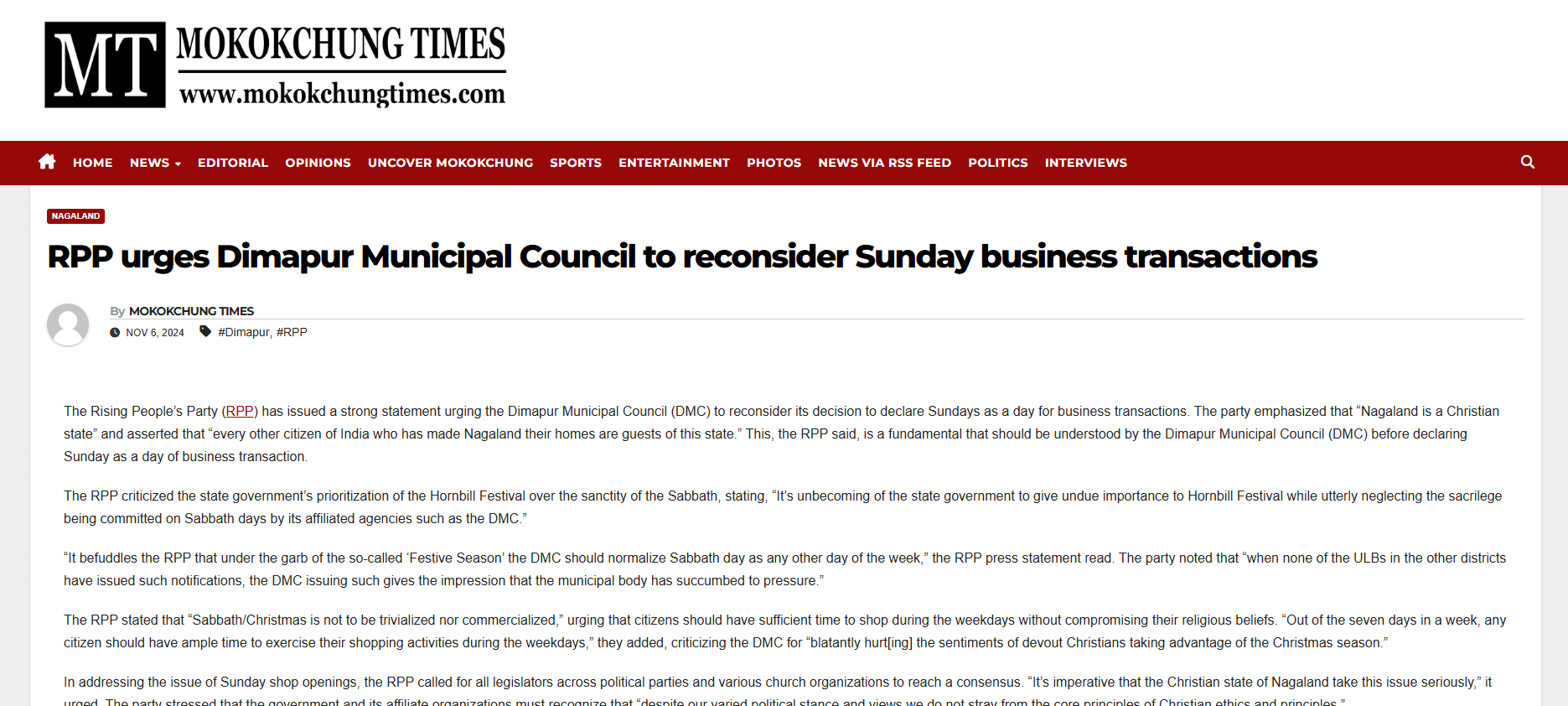 The Rising People’s Party (RPP) has issued a strong statement urging the Dimapur Municipal Council (DMC) to reconsider its decision to declare Sundays as a day for business transactions.