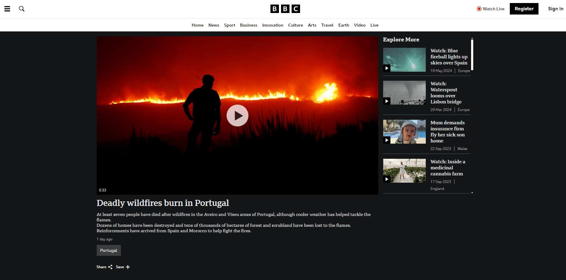 At least seven people die after wildfires in the Aveiro and Viseu areas of Portugal.