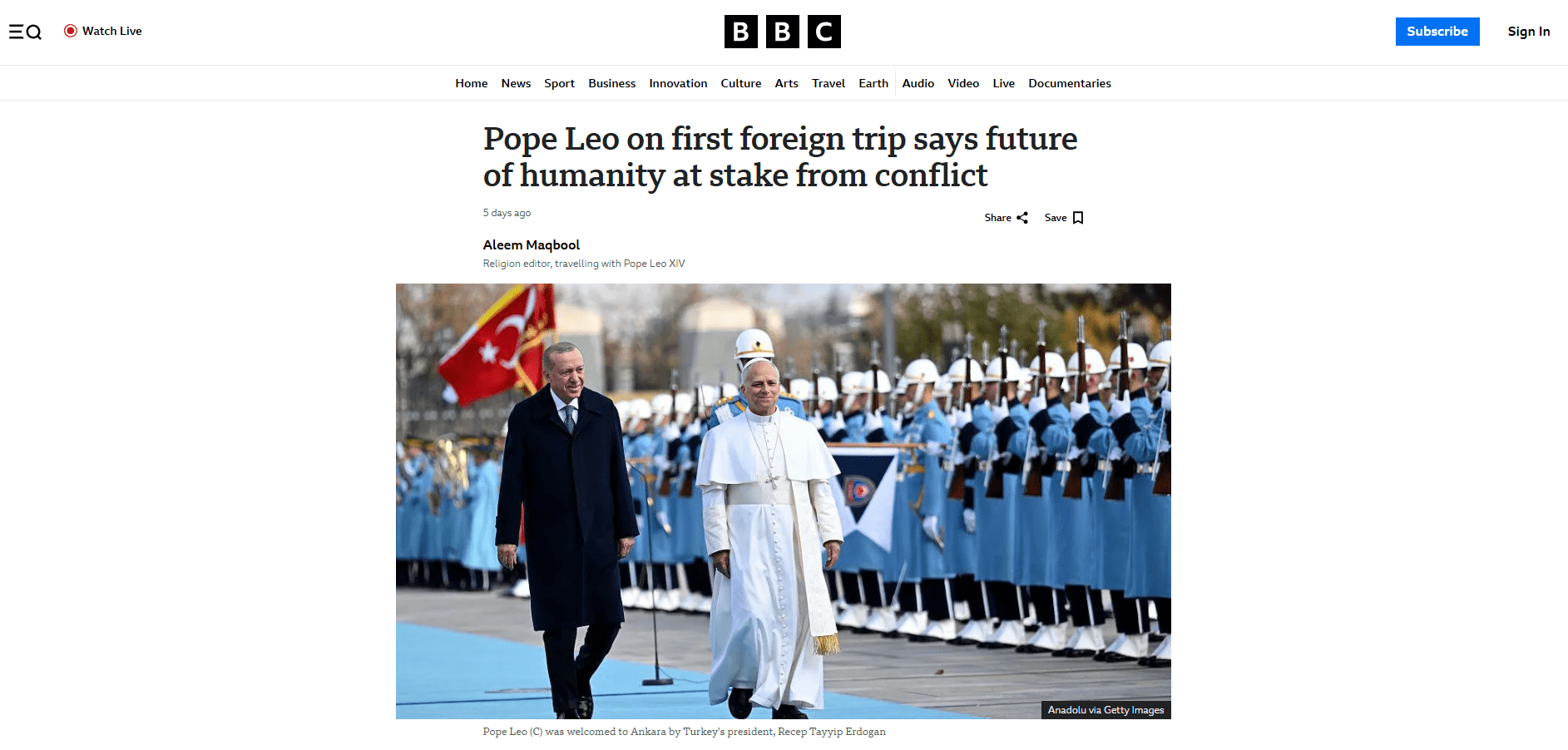 Pope Leo visits Turkey and warns humanity at stake from high level of conflict