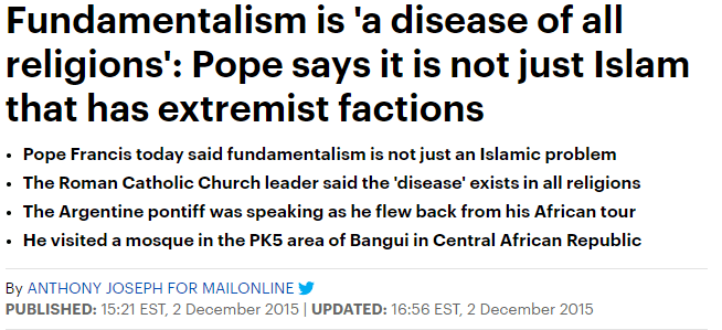 Pope Francis today said fundamentalism is not just an Islamic problem and is something which exists in all religions, including the Catholic church. The Argentine pontiff returned from his African tour today.