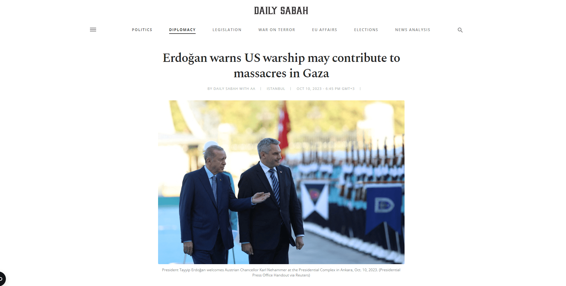 President Recep Tayyip Erdoğan warned that the U.S. aircraft carrier USS Gerald R. Ford, which happens to be the largest of its kind, and recently arrived in Israel, may contribute to serious massacres against Palestinians and destroy Gaza, amid ongoing tensions in the region.